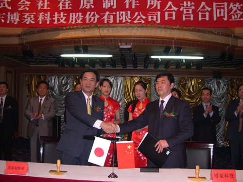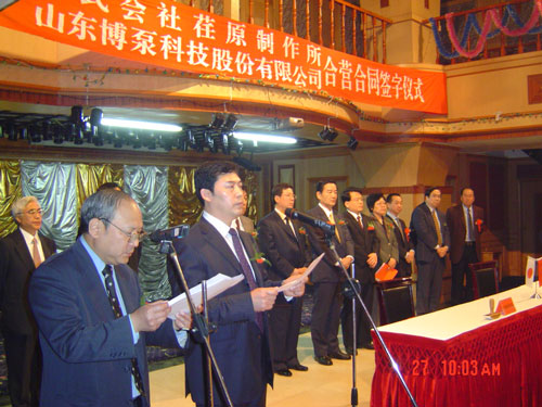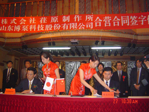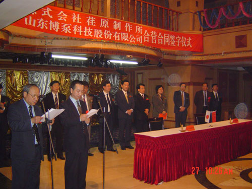 新聞中心 2005年4月27日,在博山萬杰國際大酒店山東博泵科技股份有限公司與日本株式會社荏原制作所正式簽署了注冊資本1100萬美元的合營公司――荏原博泵有限責(zé)任公司。該公司的建立將通過引進(jìn)世界最大的泵企業(yè)――日本株式會社荏原制作所的先進(jìn)技術(shù),加快大型泵、高壓泵國產(chǎn)化進(jìn)程,建成具有國際競爭力的一流企業(yè)。為中國水電、核電及超臨界火電項目,為南水北調(diào)等大型水力工程提供高質(zhì)量、高技術(shù)含量的一流泵產(chǎn)品,提升中國機(jī)械工業(yè)技術(shù)、質(zhì)量水平,促進(jìn)產(chǎn)品更新?lián)Q代,為中國電力、冶金、水力事業(yè)的發(fā)展乃至中國國民經(jīng)濟(jì)的發(fā)展做出應(yīng)有的貢獻(xiàn)。