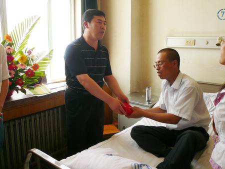 6月24日,公司總經(jīng)理孫龍平,黨總支書(shū)記張玉琴及人力資源部部長(zhǎng)姜作棟等一行,專(zhuān)程到德州人民醫(yī)院,將寄托著廣大員工深情厚誼的28150元捐款送到了孫富強(qiáng)的病榻前。鼓勵(lì)他要積極樂(lè)觀,堅(jiān)定戰(zhàn)勝病魔的信心,期盼著他早日康復(fù),重返工作崗位。