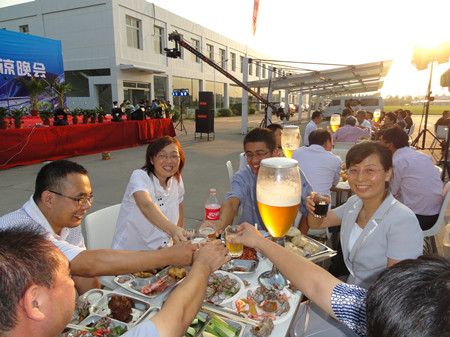 17:30分, “第四屆員工納涼晚會”正式開始。首先是員工聚餐。近400名員工,伴著歡快的樂曲聲,推杯換盞,大快朵頤。公司總經(jīng)理志賀進、常務(wù)副總經(jīng)理王正軍等公司領(lǐng)導走入員工中,與員工們親切交談,敬酒祝愿,整個會場洋溢著一張張歡樂的笑臉。