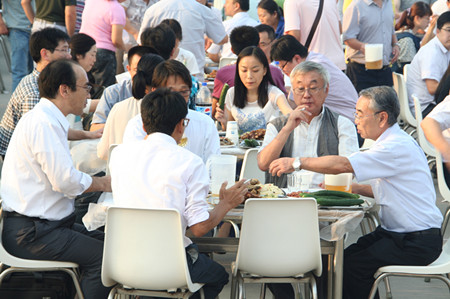 17:30,志賀進(jìn)總經(jīng)理端著酒杯,走到舞臺(tái)前,首先感謝廣大員工的辛勤努力,使公司取得很好的業(yè)績(jī),隨著一聲“干杯”,荏原博泵第五屆納涼晚會(huì)拉開(kāi)了序幕。公司380多名員工,分部門(mén)有序而坐,大家推杯換盞,興高采烈。公司領(lǐng)導(dǎo)挨桌給員工們敬酒,大家沒(méi)有了上下級(jí)的拘謹(jǐn),一派歡樂(lè)祥和的景象。